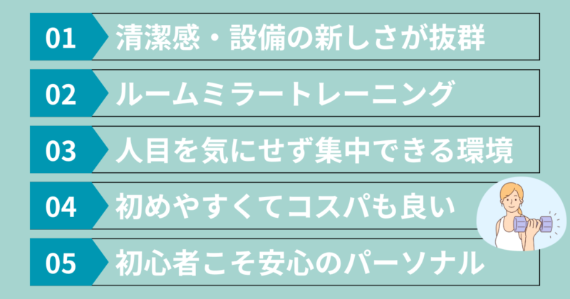特にジム初心者や、これから習慣化したい人にとっては、静かに続けられる場所としておすすめ。