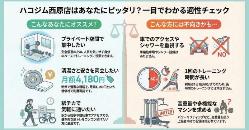 ハコジム西原店のいい口コミ・残念な口コミだけでなく、他店舗との違いや、どんな人に向いているか/向いていないかもわかりやすく紹介。